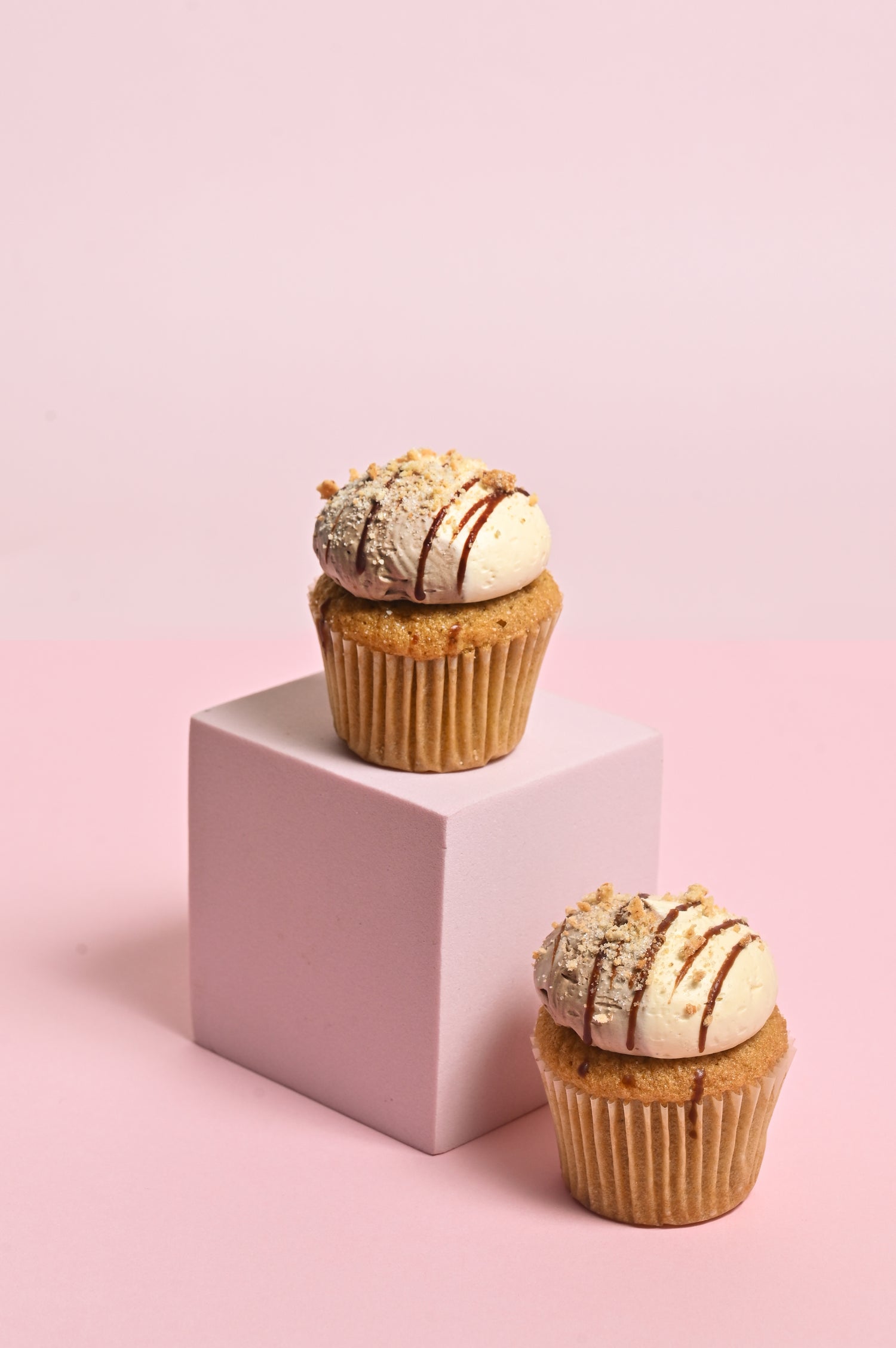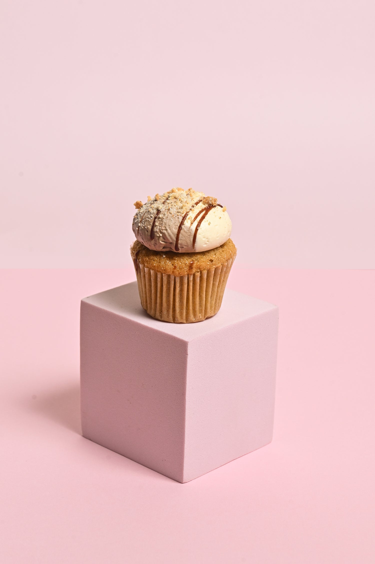 Coffee-infused moist cupcake topped with chocolate and coffee buttercream, rolled in wafer crumbs.
