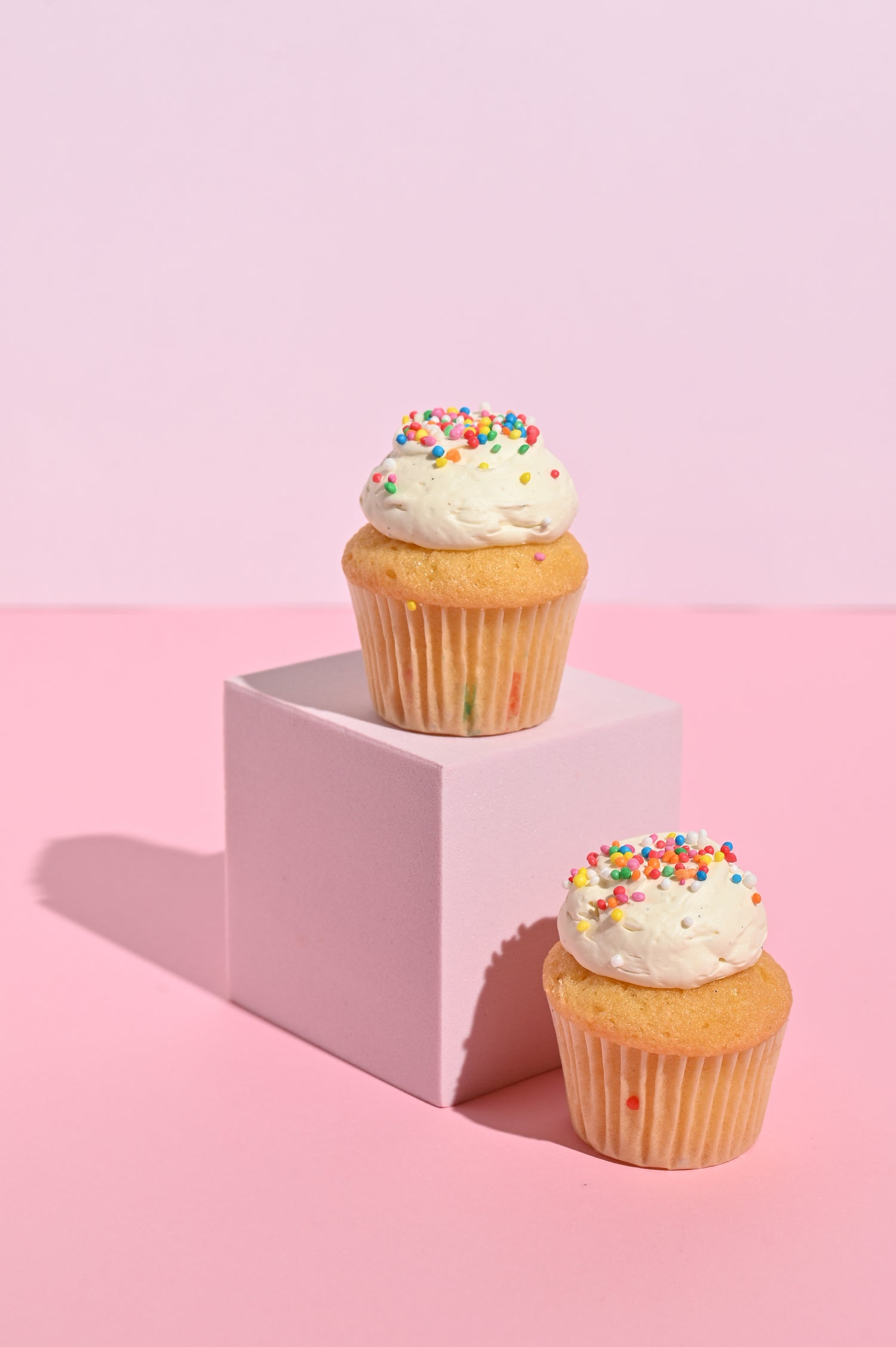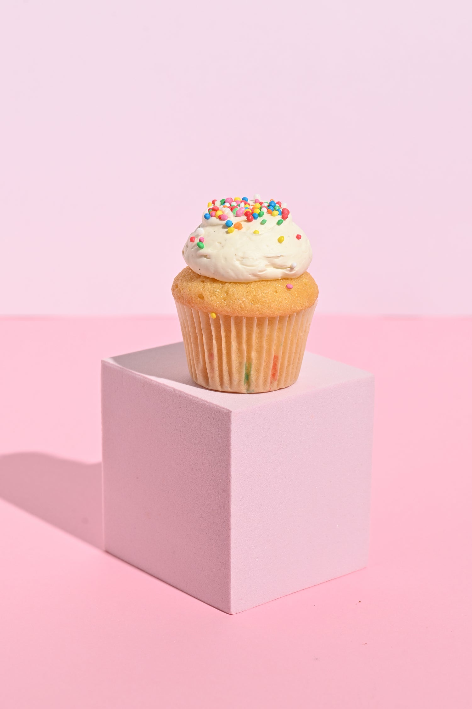Madagascar vanilla bean moist cupcake topped with vanilla buttercream, sprinkled with 100s and 1000s.
